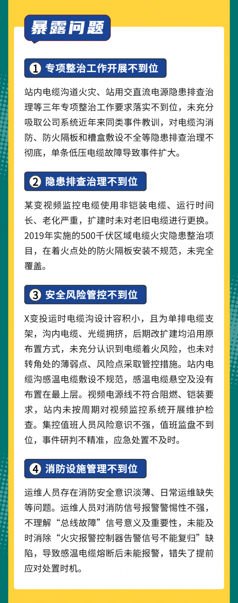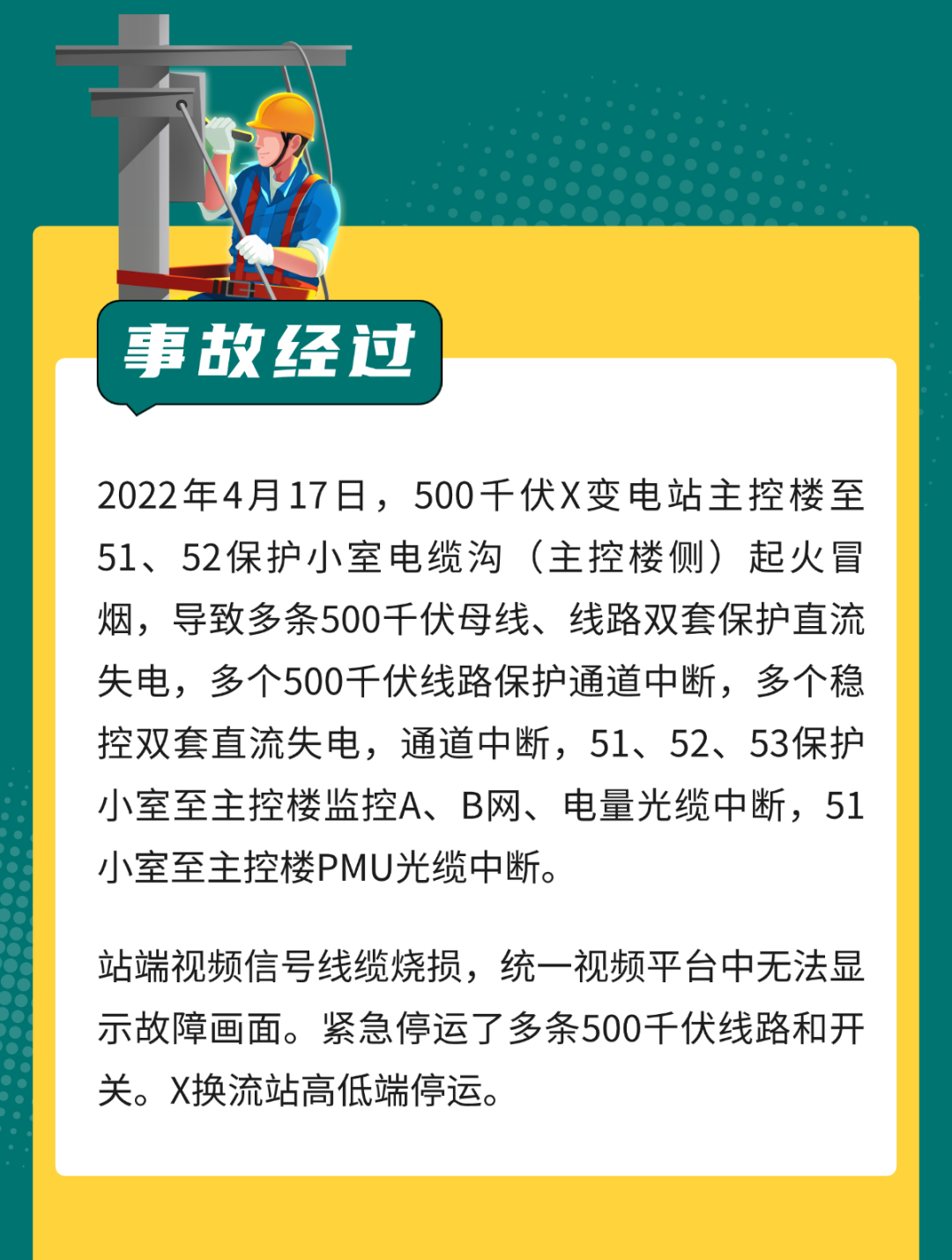 2022 年 4 月 17 日,某公司 500kV 一变电站,站内电缆沟电缆短路着火,导致 51、52 保护小室站用直流系统电源电缆受损,保护小室内 500kV 线路保护、500kV Ⅰ、Ⅱ 母线保护和站内稳控装置失电,6 回路 500kV 路线被迫停运。
