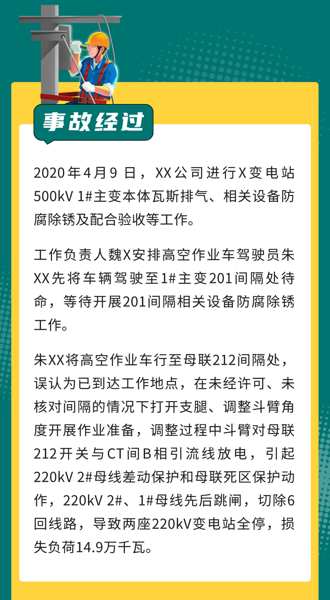 2020年4月9日,某公司在 500kV 一变电站检修期间,高空作业车斗臂与带电设备安全距离不足放电,导致 220kV 1#、2# 母线停运,损失负荷 14.9 万 kW。