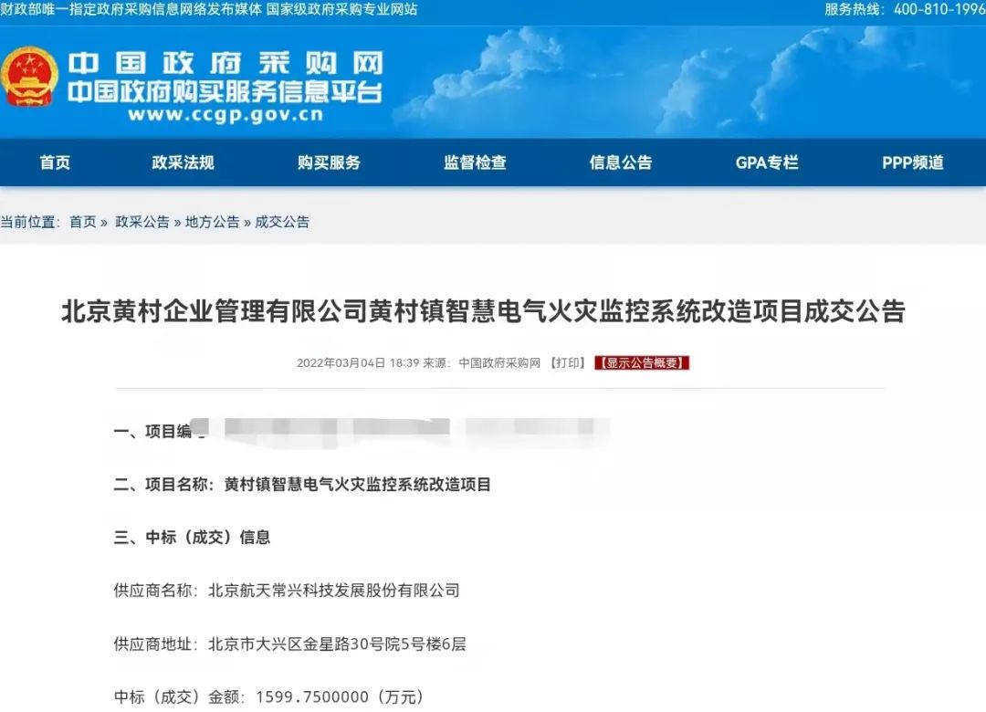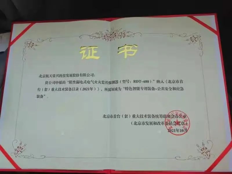 2022年3月4日,中国政府采购网公布了航天常兴成功中标北京黄村镇智慧电气火灾监控系统改造项目。作为该项目唯一一家中标企业,航天常兴拥有无可比拟的竞争优势。在北京市首批首台(套)重大技术装备授牌仪式中,航天常兴携大国重器脱颖而出。航天常兴是电气火灾监控领域唯一一家首台(套)入选企业,不仅技术过硬,而且得到了政府部门的高度认可,为我国经济高质量发展树信心、添动力。