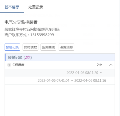 接收到此预警后,中心值守人员立即拨打此商户电话,通知该商户业主,告知商户线缆温度异常过高,具有重大安全隐患,请其立刻停止大功率用电器并断电,并让该业主立刻通知电工前往处置,随即派单中心巡检人员,让其立刻前往现场复核处置该预警。
