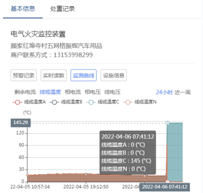 2022年04月06日07点41分04秒,兰山街道智慧消防中心(以下简称“中心”)一级平台接收到颜家红埠寺村五网格振辉汽车用品商铺中安装的智慧用电设备发出的温度预警。