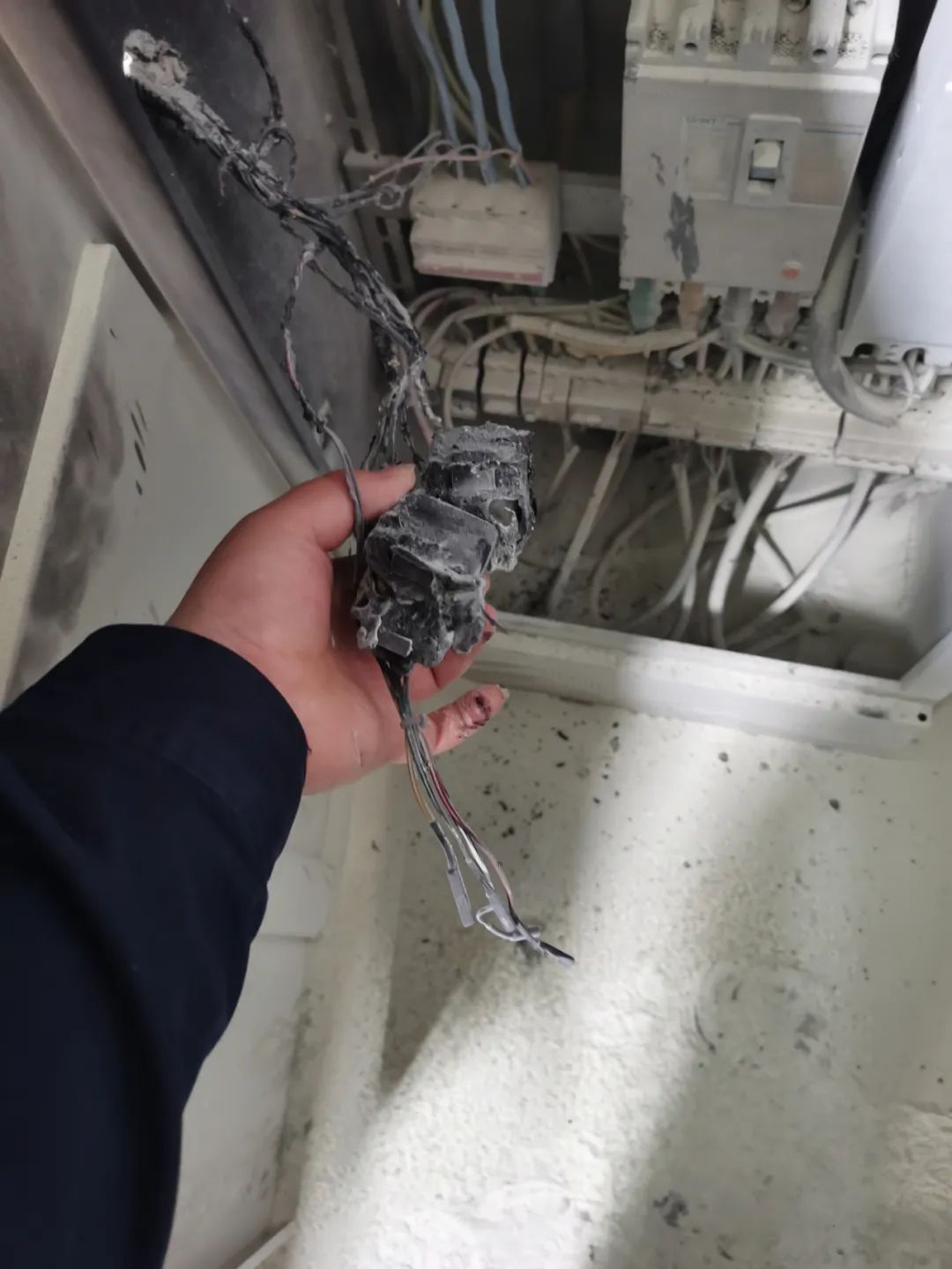 当中心巡检人员抵达现场时,老板正在处置,随即巡检人员协助老板处置,发现该商户配电箱内空开与电线已经烧焦。