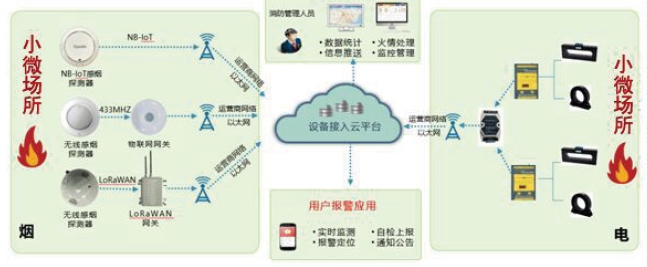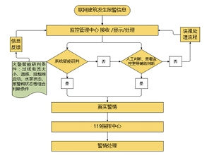 联网场所发生火警或故障,通过温度传感器、剩余电流互感器等前端设备监测到的信息,通过传输装置上传至云服务中心,消防部门可通过监控中心以及手机终端获取实时上传的火警信息,及时确认火警真伪,并快速处理。